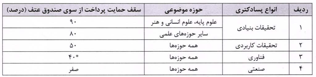 حقوق و مزایای ماهانه محقق پسادکتری معادل ۸۰ درصد حقوق و مزایای ماهانه استادیار پایه یک وزارت علوم، تحقیقات و فناوری است که حداکثر سهم صندوق عتف برای انواع پسادکتری بر اساس جدول زیر توسط کارگروه تعیین می‌شود. بدیهی است مابه التفاوت مبلغ حقوق و مزایای ماهانه تا سقف مقرر را باید مؤسسه/ مرکز فناوری/ واحد صنعتی در ابتدای هر سه ماه پرداخت کند.