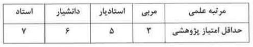 جدول ۱- حداقل امتیاز پژوهشی لازم برای ترفیع سالانه به تفکیک مرتبه علمی: