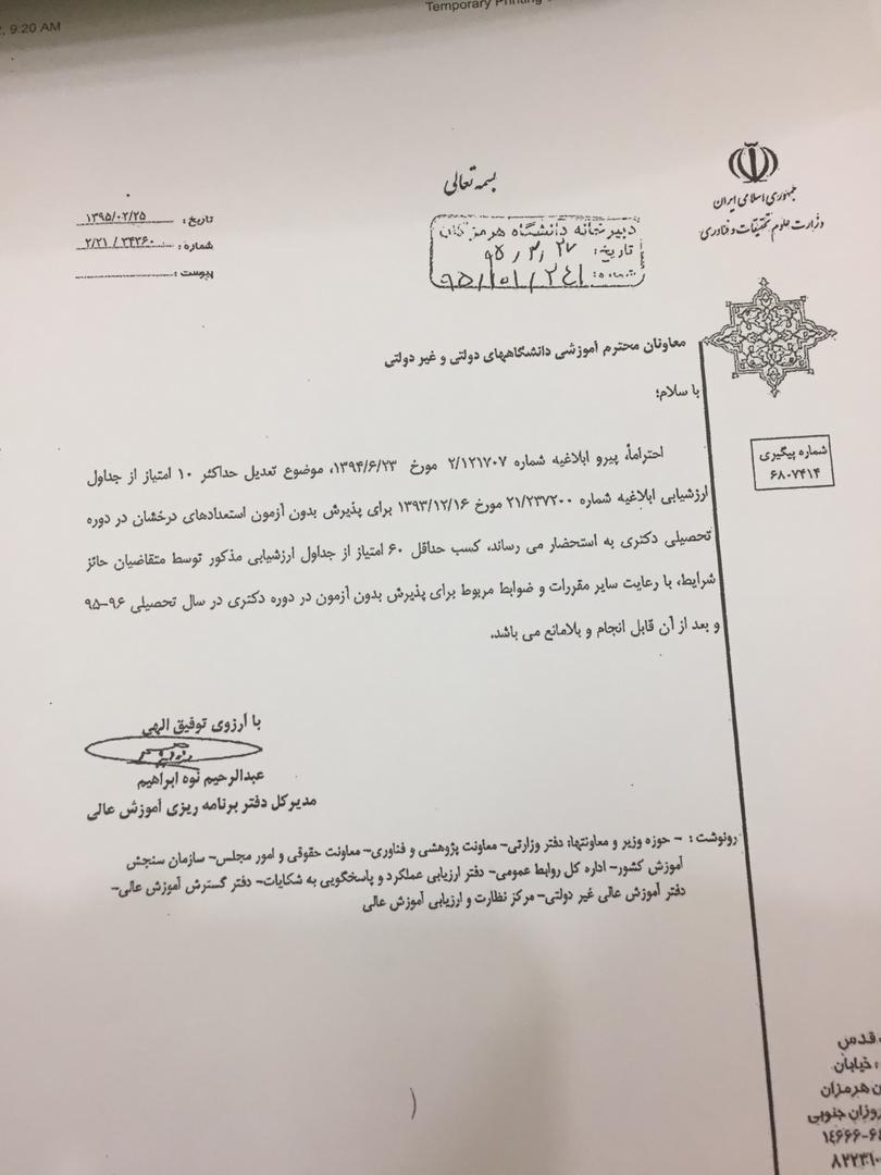 ابلاغیه تعدیل امتیاز متقاضیان دکتری بدون آزمون از 70 به 60