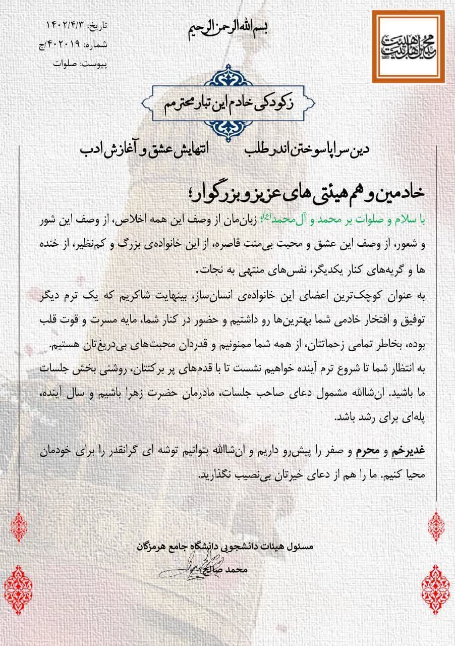 تقدیر نامه مسئول هیئت دانشجویی دانشگاه هرمزگان از خادمین هیئت محبین اهل بیت علیهم السلام