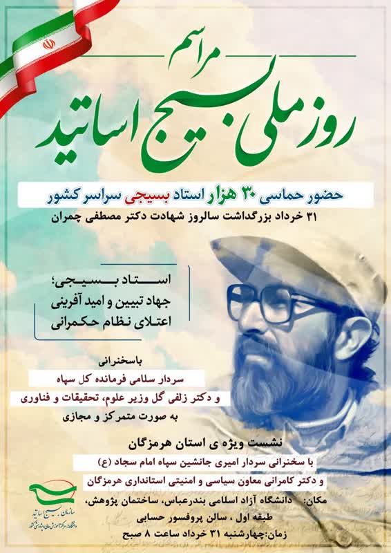 31 خرداد سالروز شهادت دکتر مصطفی چمران و روز ملی بسیج اساتید گرامی باد.