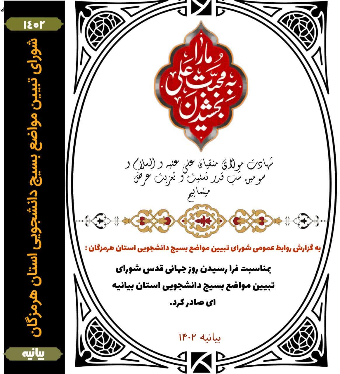 بمناسبت فرارسیدن روز جهانی قدس شورای تبیین مواضع بسیج دانشجویی استان هرمزگان بیانیه ای صادر کرد.