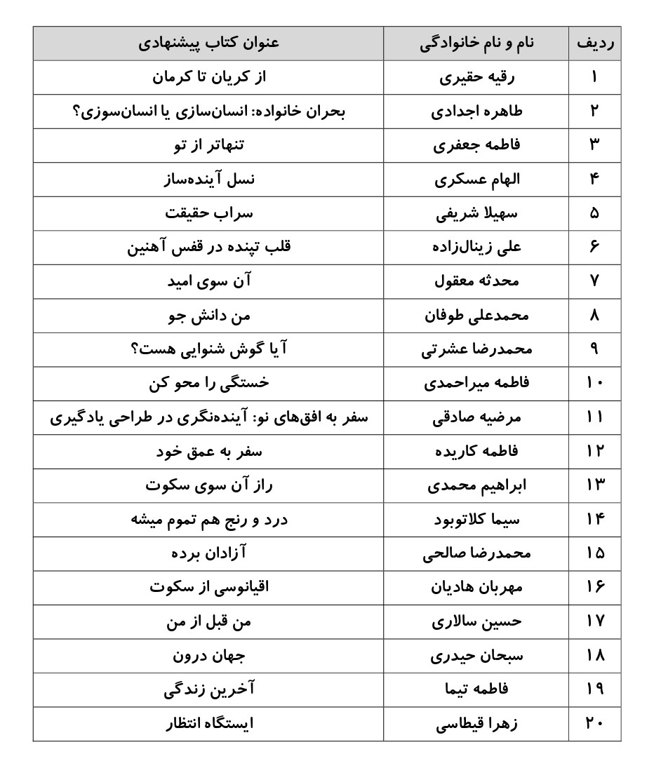 پس از بررسی آثار ارسالی توسط دانشجویان شرکت کننده در مسابقه هفته کتاب و کتابخوانی ویژه دانشجویان، قرعه‌کشی از بین آثار، انجام و تعداد 20 اثر به عنوان منتخبین این مسابقه اعلام گردید.