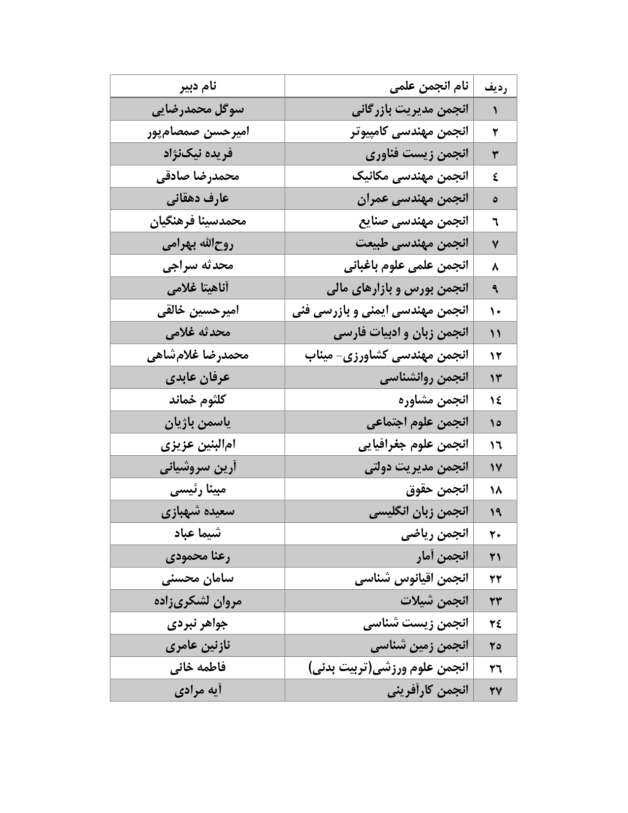 در این انتخابات، دبیران منتخب انجمن‌های علمی در رشته‌های مختلف، پس از طی مراحل ارزیابی، رأی‌گیری و تأیید نهایی، به شرح زیر معرفی می‌شوند: