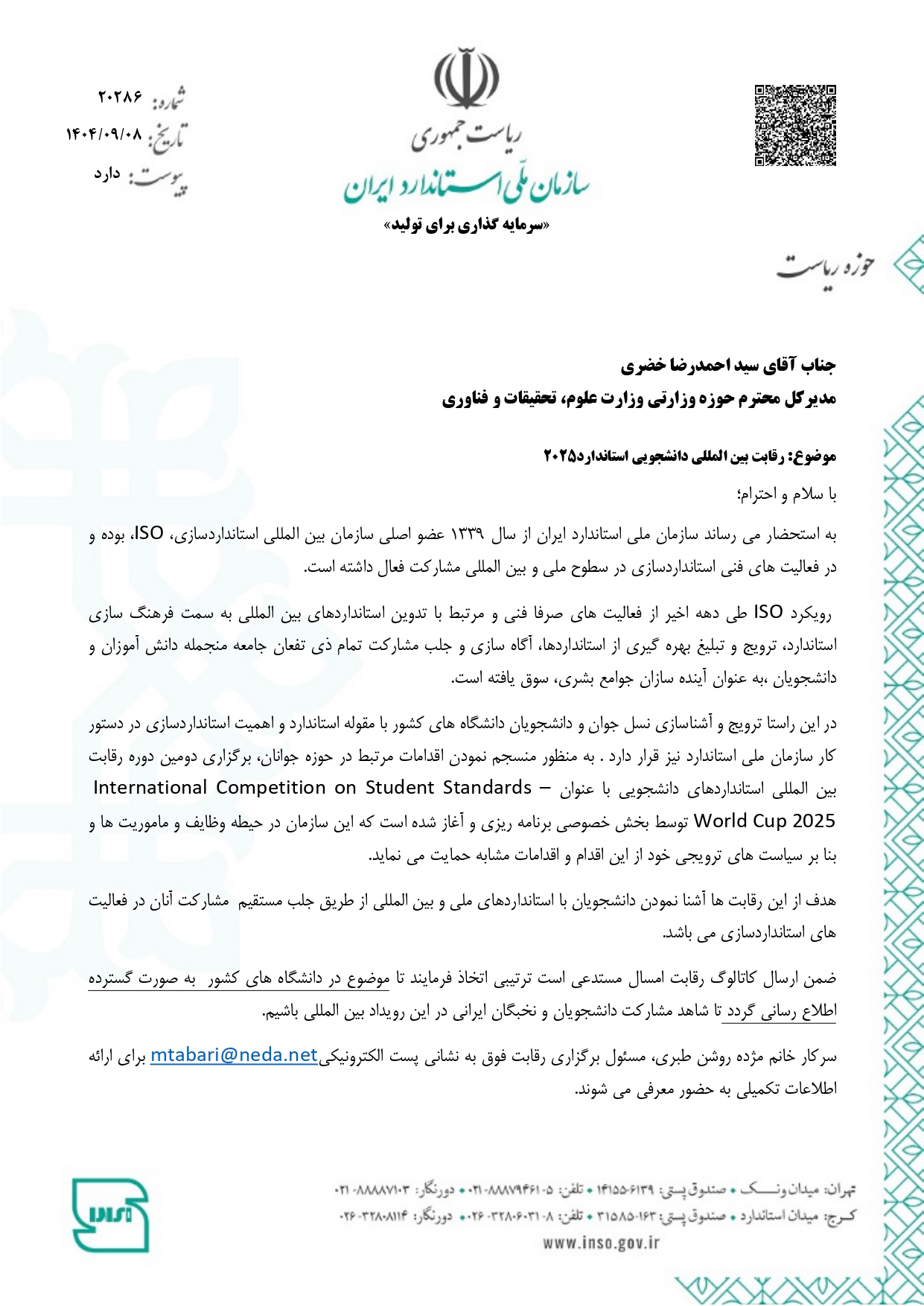 سازمان ملی استاندارد ایران با هدف ترویج و آشنایی نسل جوان و دانشجویان با مقوله استاندارد و نقش آن در توسعه جامعه، فراخوان مشارکت در دومین دوره رقابت بین‌المللی استانداردهای دانشجویی (World Cup 2025) را منتشر کرد.
