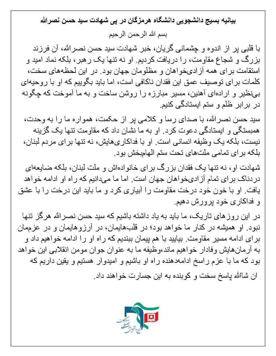 بیانیه بسیج دانشجویی دانشگاه هرمزگان در پی شهادت سید حسن نصرالله