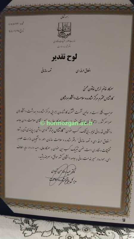 سرکار خانم نرگس خاتون محسنی در اولین نشست مشترک کارشناسان مراکز مشاوره و بهداشت دانشگاه های سراسر کشور به عنوان "کارشناس برتر" انتخاب شد