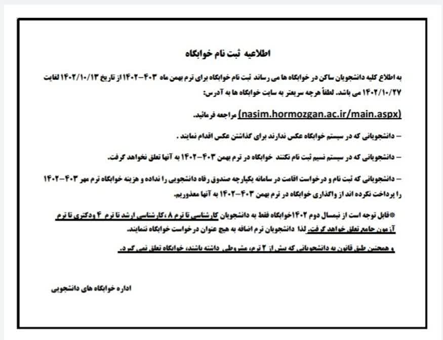 قابل توجه دانشجویان خوابگاهی