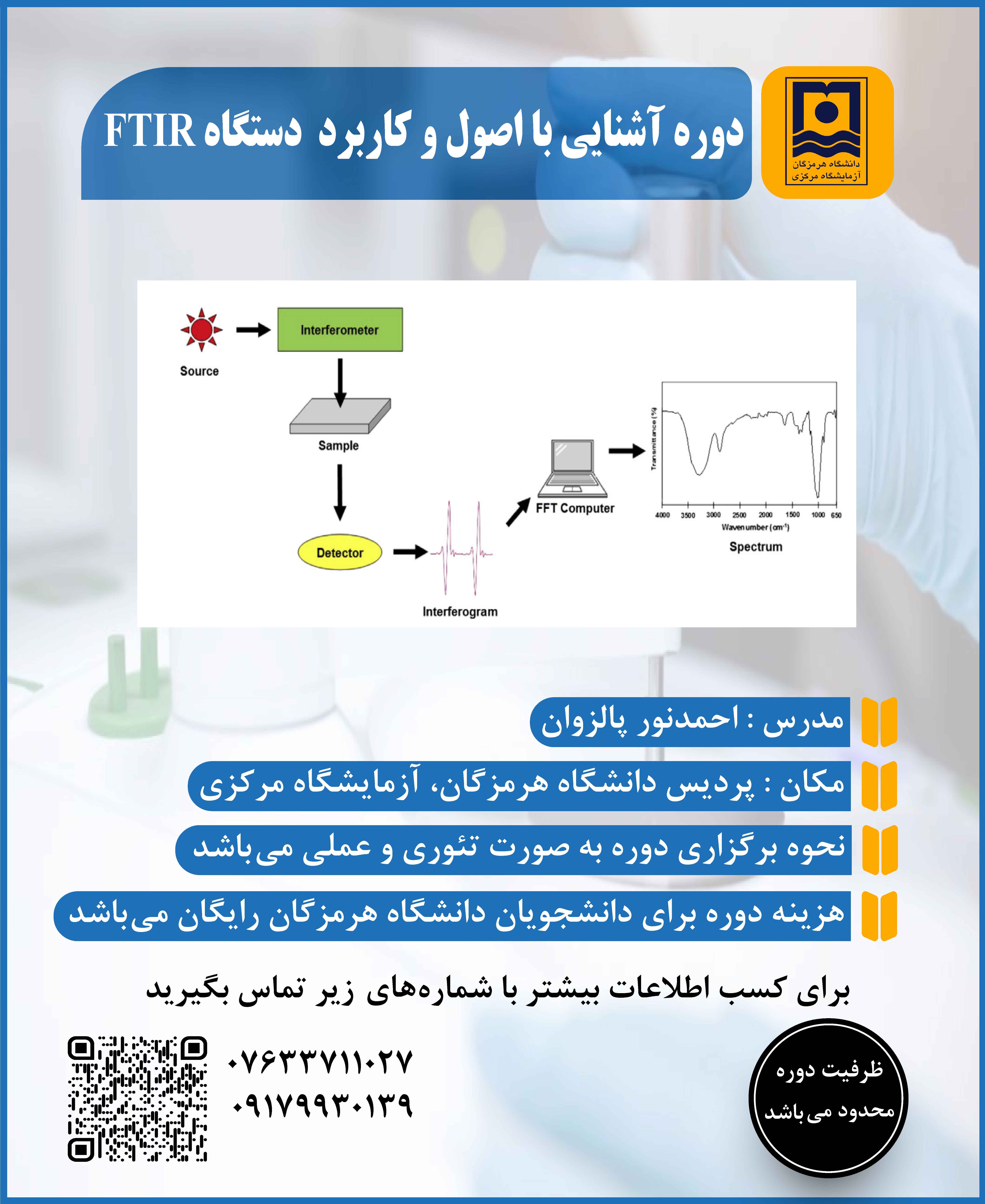 آزمایشگاه مرکزی در نظر دارد در راستای توانمندسازی دانشجویان، کارگاه آشنایی با اصول و کاربرد دستگاه  FT-IR را  برگزار کند.