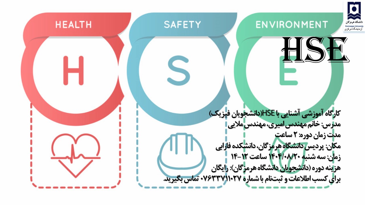 به اطلاع دانشجویان گرامی می‌رساند، آزمایشگاه مرکزی دانشگاه در راستای ارتقای سطح آگاهی و ایمنی در محیط‌های آزمایشگاهی، دوره آموزشی "ایمنی در آزمایشگاه (HSE)" را ویژه دانشجویان جدیدالورود برگزار می‌کند.