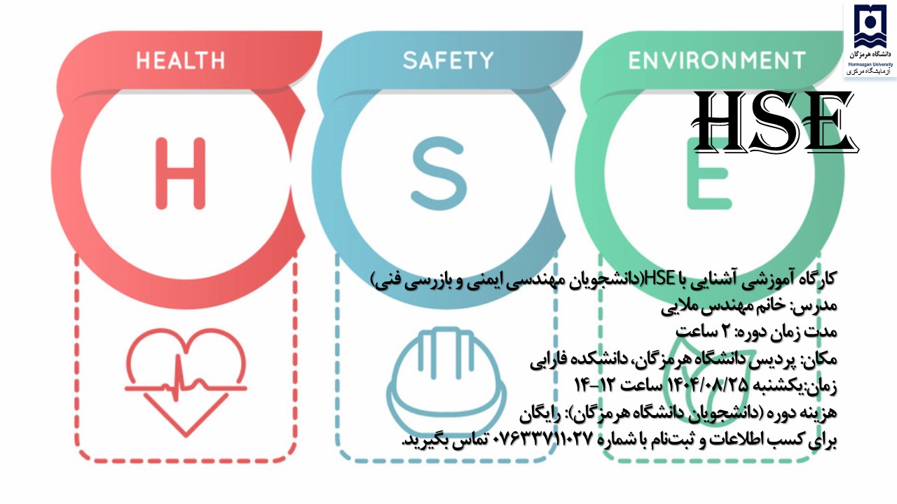 به اطلاع دانشجویان گرامی می‌رساند، آزمایشگاه مرکزی دانشگاه در راستای ارتقای سطح آگاهی و ایمنی در محیط‌های آزمایشگاهی، دوره آموزشی "ایمنی در آزمایشگاه (HSE)" را ویژه دانشجویان جدیدالورود برگزار می‌کند.