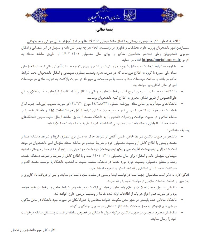 اطلاعیه میهمانی وانتقالی