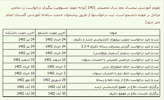تقویم آموزشی نیمسال دوم 1401 ( دانشجویان تحصیلات تکمیلی)