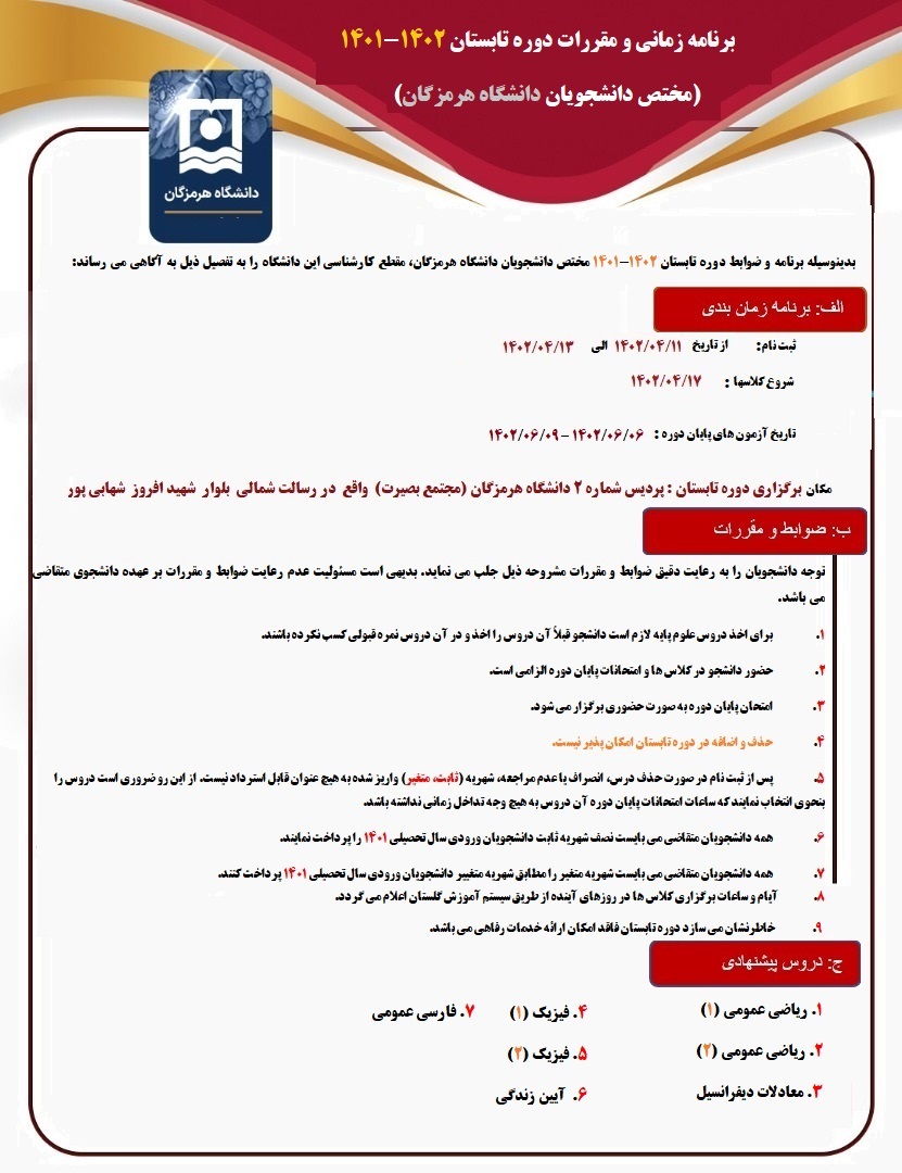 برنامه زمانی و مقررات دوره تابستان 1402-1401 (مختص دانشجویان دانشگاه هرمزگان)
