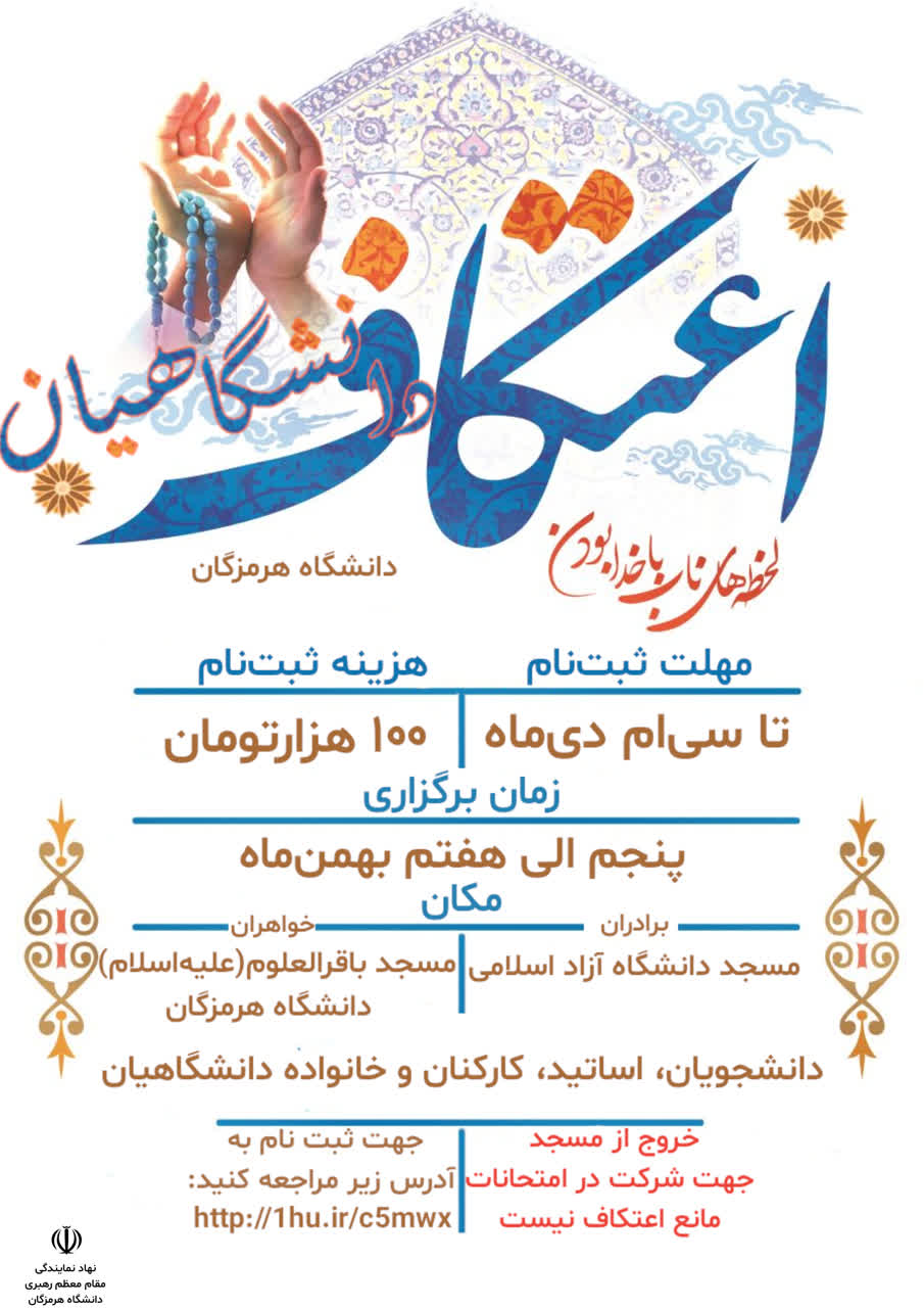 مراسم معنوی اعتکاف ویژه دانشجویان، اساتید، کارکنان و خانواده محترم اساتید و کارکنان از 13 تا 15 رجب 1445 (مصادف با 5 تا 7 بهمن‌ماه 1402) در مساجد دانشگاه‌های استان هرمزگان برگزار می‌شود.