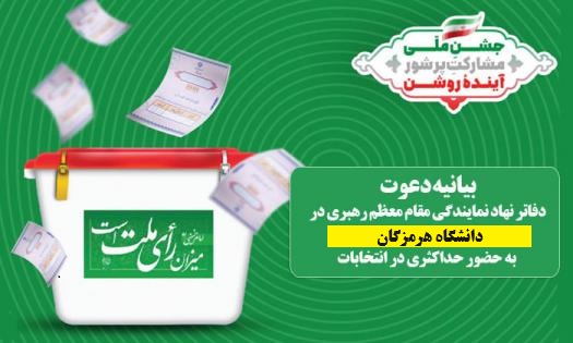 دفتر نهاد نمایندگی مقام معظم رهبری در دانشگاه هرمزگان طی بیانیه‌ای از دانشگاهیان کشور برای حضور حداکثری در انتخابات دعوت کرد.