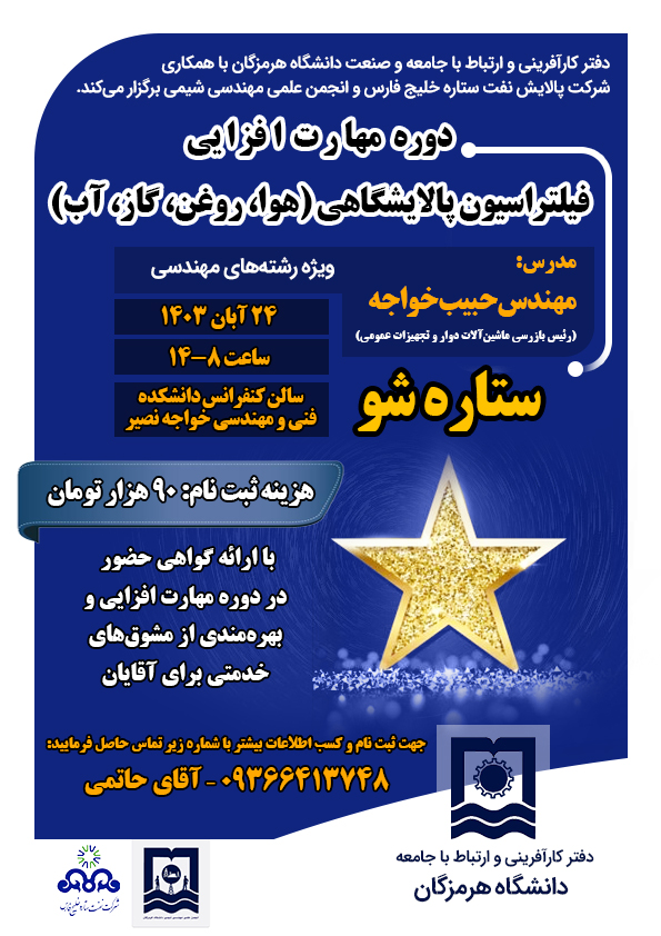 برگزاری کارگاه مهارت افزائی با عنوان فیلتراسیون پالایشگاهی (هوا، روغن، گاز، آب)