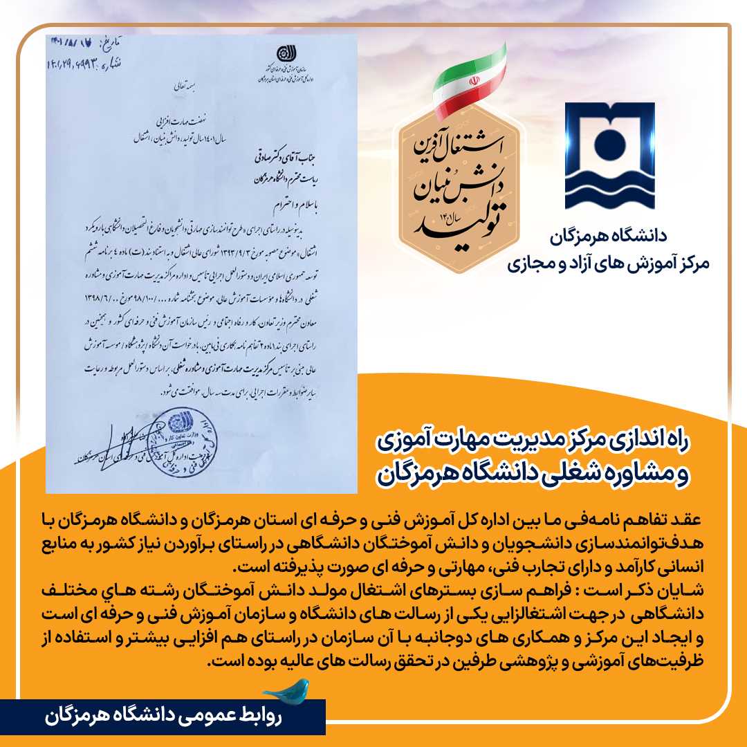 عقد تفاهم نامه فی ما بين اداره كل آموزش فنی و حرفه ای استان هرمزگان و دانشگاه هرمزگان با هدف توانمندسازی دانشجویان و دانش آموختگان دانشگاهی در راستای برآوردن نیاز کشور به منابع انسانی کارآمد و دارای تجارب فنی، مهارتی و حرفه ای صورت پذیرفته است.