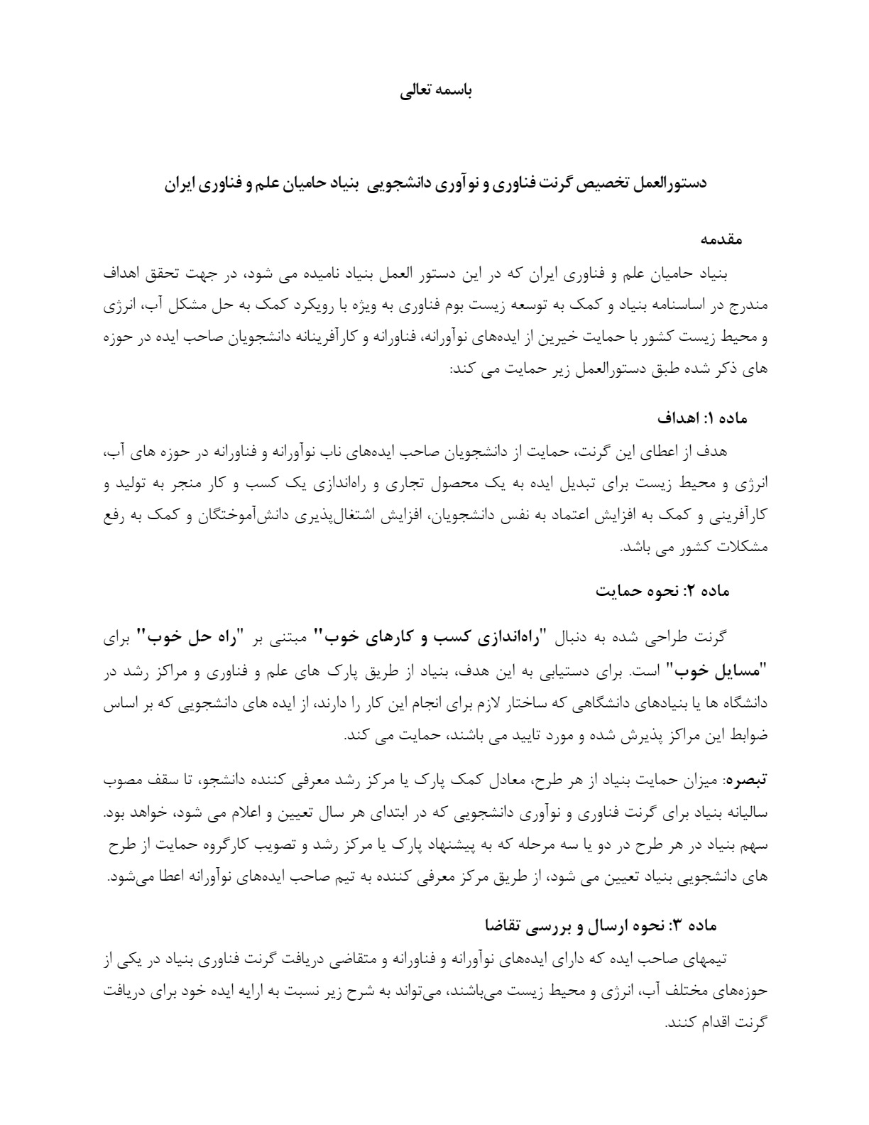 حمایت از دانشجویان صاحب ایده در چارچوب دستورالعمل تخصیص گرنت فناوری و نوآوری بنیاد حامیان علم و فناوری ایران به استحضار کلیه دانشجویان گرامی می رساند بنیاد حامیان علم و فناوری ایران در راستای اهداف خود و به منظور کمک به توسعه زیست بوم فناوری با رویکرد حل مشکلات آب، انرژی و محیط زیست کشور، با کمک خیرین و واقفین حوزه علم و فناوری از ایده های نوآورانه، فناورانه و کارآفرینانه دانشجویان صاحب ایده در چارچوب دستورالعمل پیوست حمایت می کند.