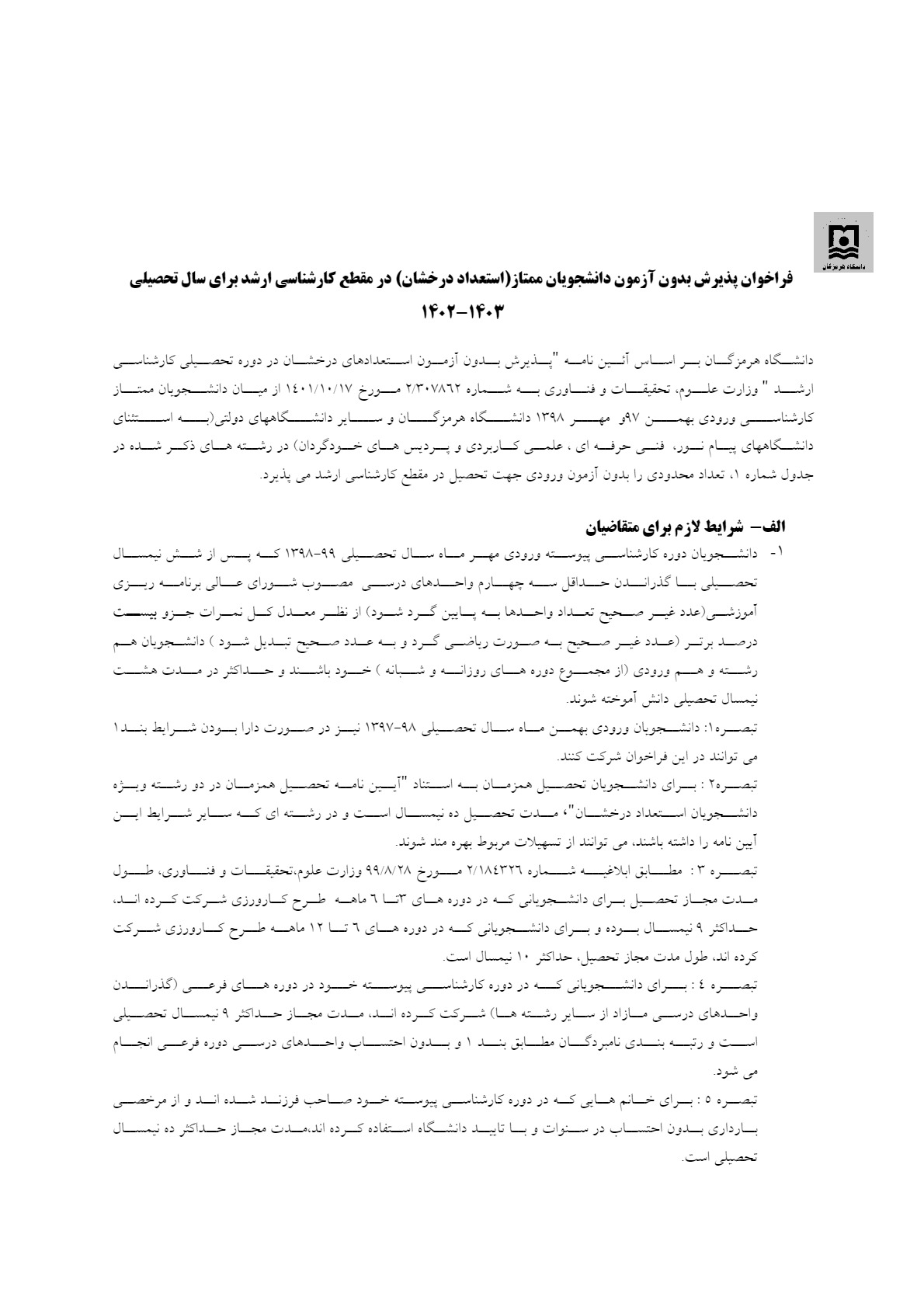 فراخوان پذیرش دانشجو به شیوه بدون آزمون در مقطع کارشناسی ارشد برای سال تحصیلی403-1402