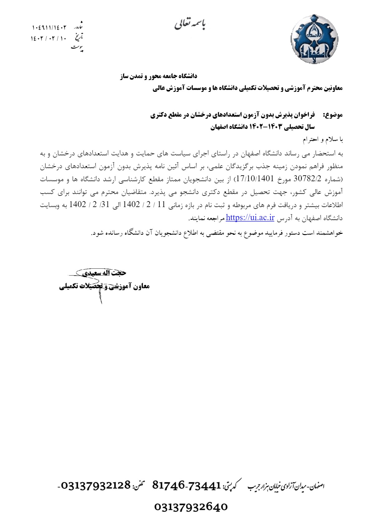 فراخوان پذیرش بدون آزمون استعدادهاي درخشان دانشگاه اصفها ن -در مقطع دکتر ي سال تحصیلی 1403-1402
