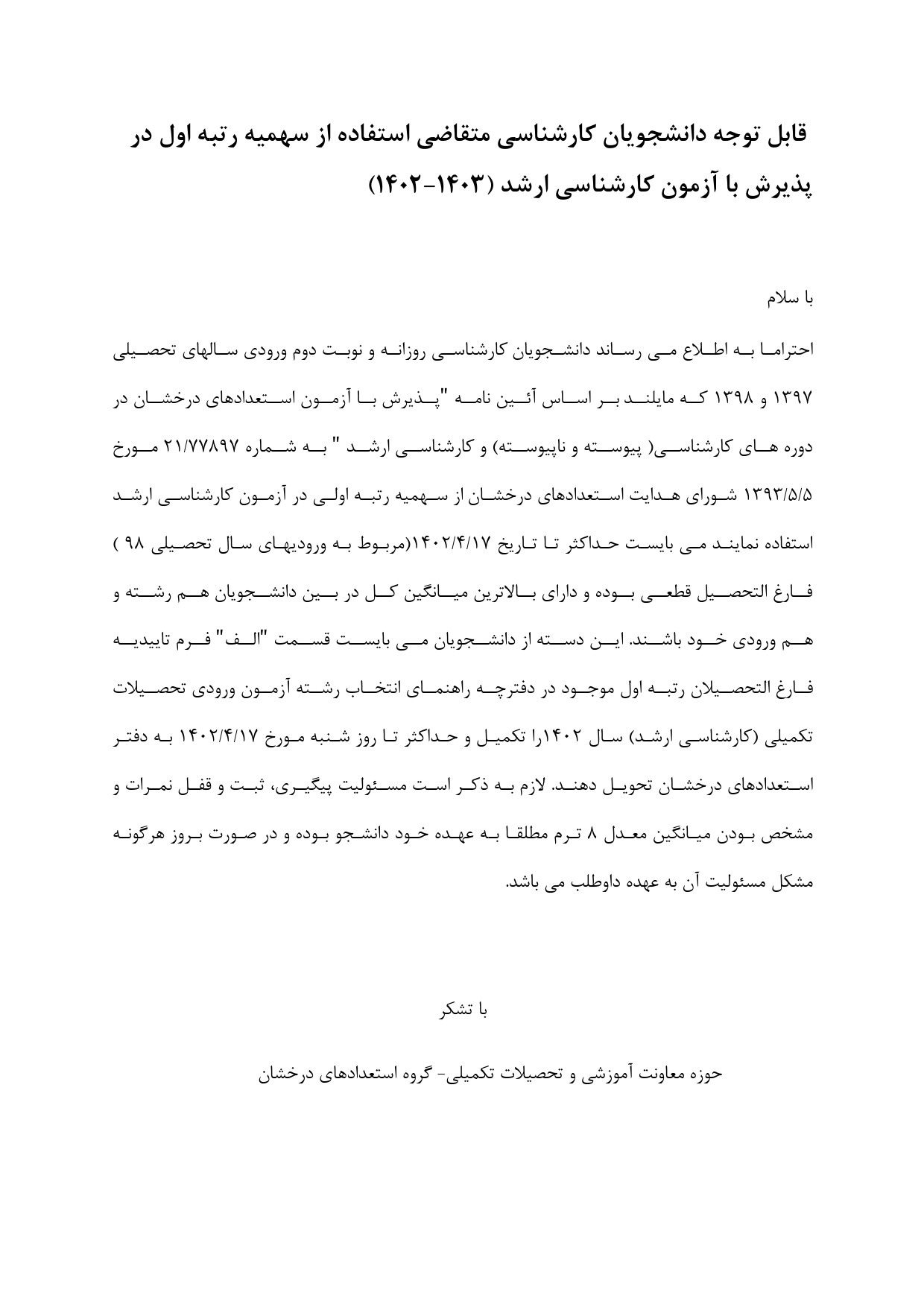 استفاده از سهمیه رتبه یک در کنکور کارشناسی ارشد ویژه دانشجویان مقطع کارشناسی ورودی سال های 1397 و 1398