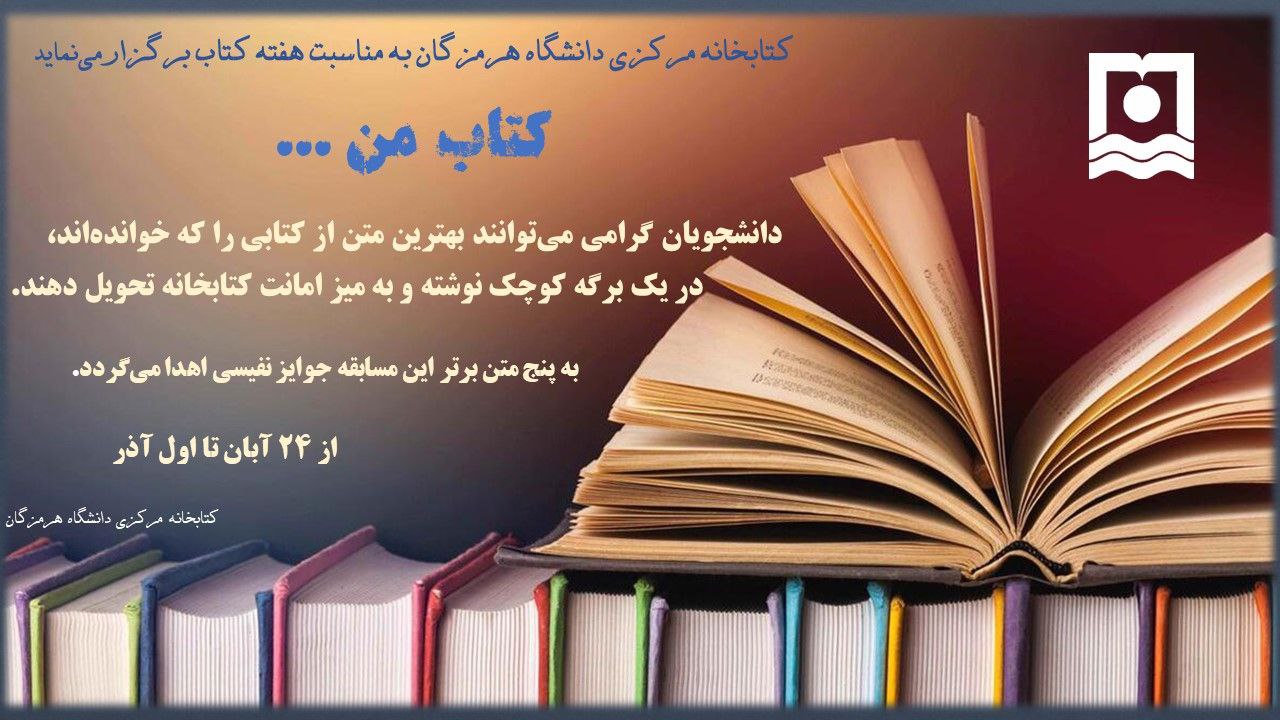 کتابخانه مرکزی به مناسبت بزرگداشت هفته کتاب و کتابخوانی مسابقه ای برگزار می کند. بهترین متن یا شعری که خوانده اید را در یک پاراگراف نوشته و به میز امانت کتابخانه تحویل دهید. با احترام به ۵ متن برتر جوایزی تعلق می گیرد.