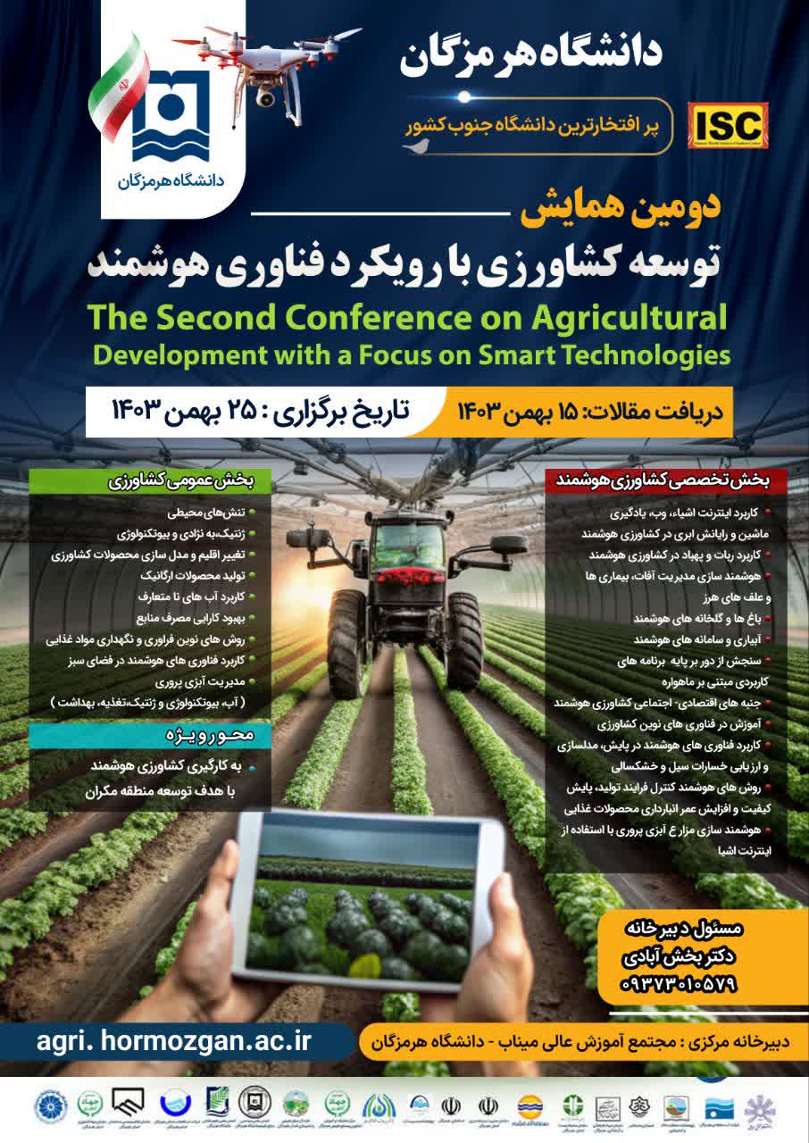دومین همایش کشاورزی هوشمند در تاریخ 25 بهمن ماه در محل مجتمع آموزش عالی میناب برگزار خواهد شد.