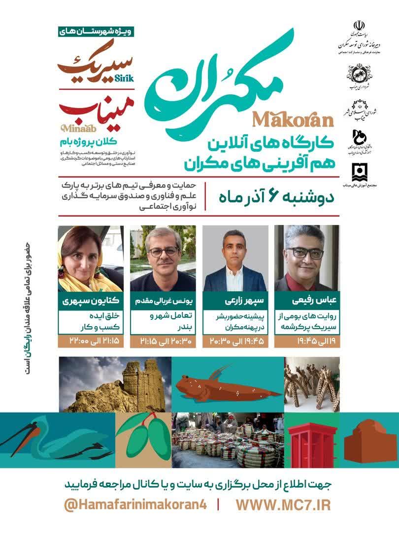 میناب و سیریک و حوالی آن‌ها سرزمینِ افراد خلاق و کارآفرین است. در اولین هم آفرینی مکران دور هم‌جمع می‌شویم ، از ایده تا اجرای کسب و کارهای نوآورانه تا طراحی راه حل، خلق فرآیندهایی برای پیشرفت. چند روز همکاری، هم آفرینی و فرصتِ خلق و ارائه به سرمایه گذاران در انتظار ماست....